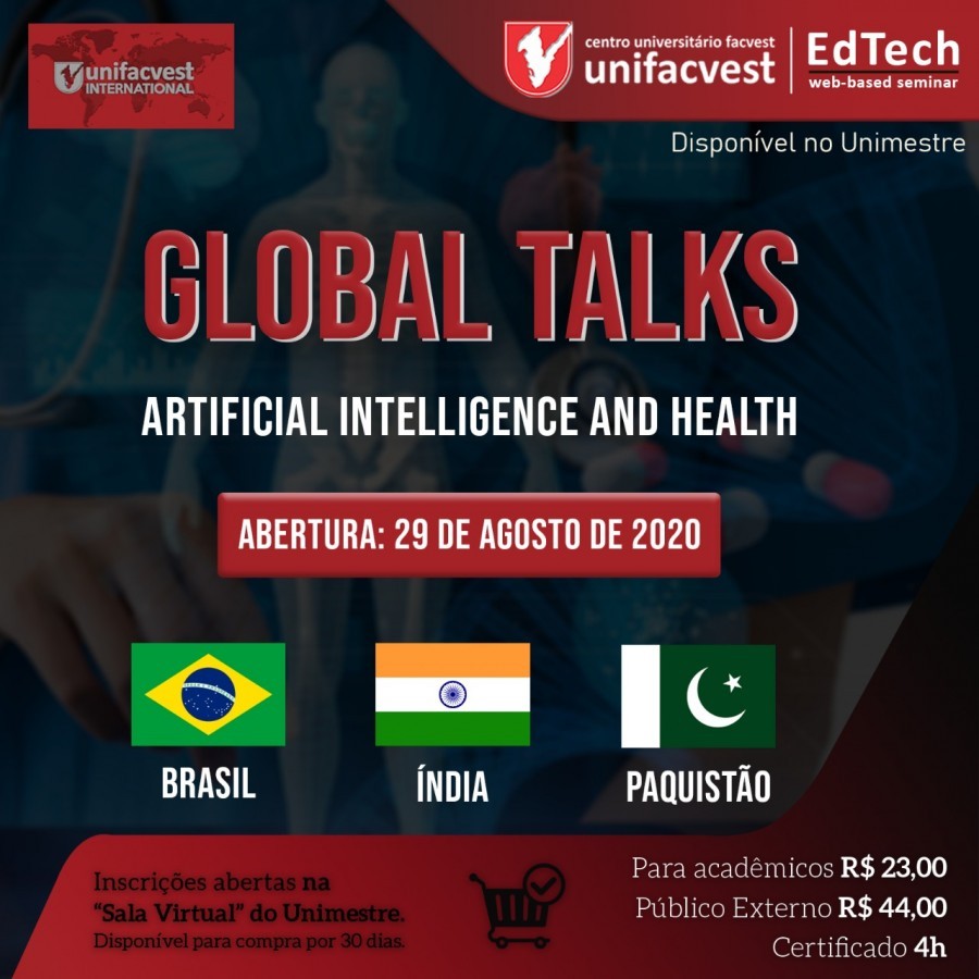 A Unifacvest promove a partir das 8h30min (horário de Brasília) deste sábado, 29/08, mais um Webinar Internacional. O Global Talks "Artificial Intelligence and Health" online terá como tema a Inteligência Artificial aplicada aos estudos da saúde. Participarão pesquisadores do Brasil, Índia e Paquistão.