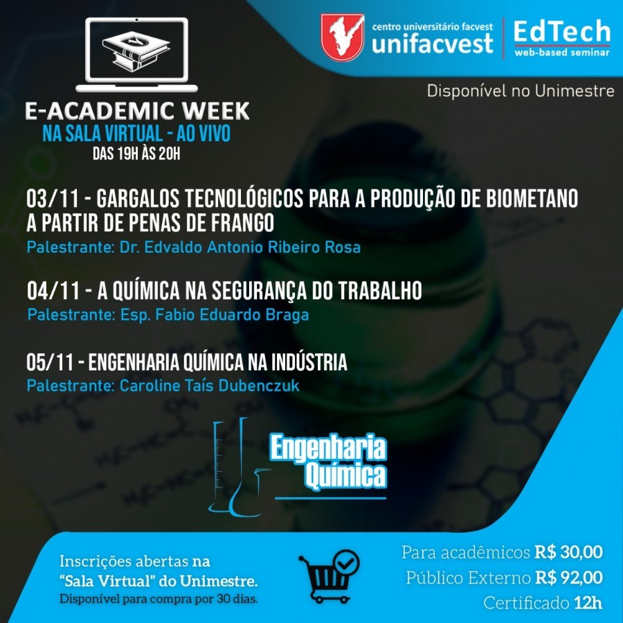 Não perca estas lives. A E-academic Week de Engenharia Química será ao vivo e inicia na próxima terça-feira (03/11). A participação para os acadêmicos do curso é obrigatória com verificação de presença virtual, pois será no horário regular das aulas.