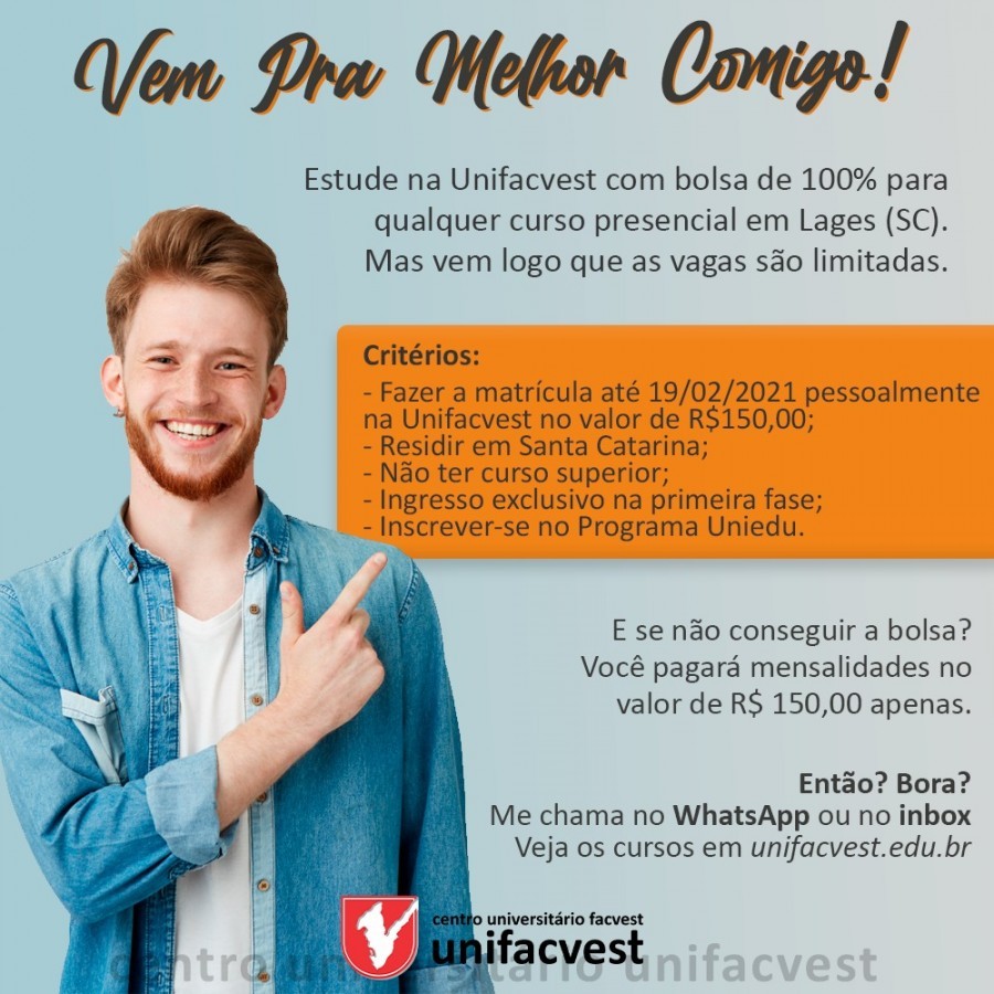 Estude na Unifacvest com bolsa de 100% para qualquer curso presencial em Lages (SC). Mas vem logo que as vagas são limitadas!