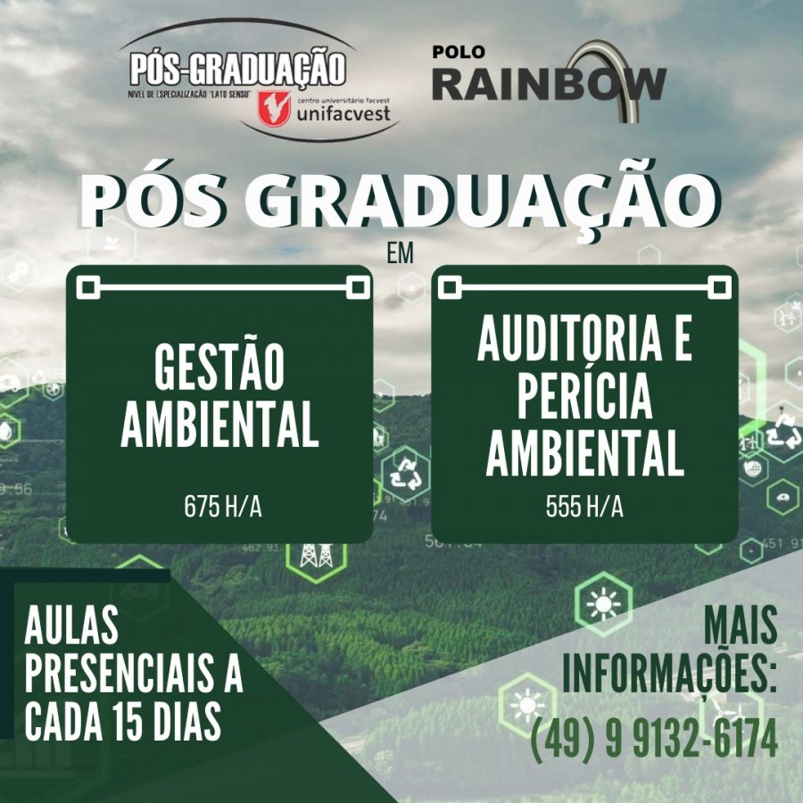 Pós-Graduação em Gestão Ambiental e Pós-Graduação em Auditoria e Perícia Ambiental na Unifacvest. Aulas presenciais quinzenais. Inscrições pelo whatsapp: (49) 991 326 174