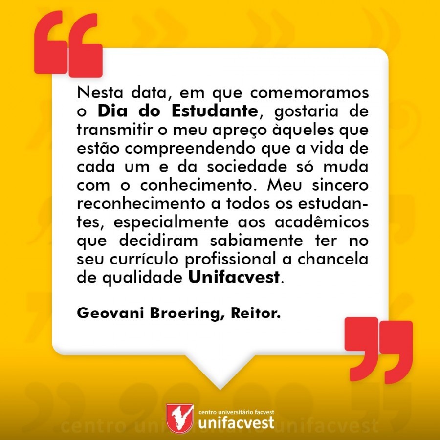"Nesta data, em que comemoramos, no Brasil, o Dia do Estudante, gostaria de transmitir o meu apreço àqueles que estão compreendendo que a vida de cada um e da sociedade só muda com o conhecimento. Meu sincero reconhecimento a todos os estudantes, especialmente aos acadêmicos que decidiram sabiamente ter no seu currículo profissional a chancela de qualidade do Centro Universitário Unifacvest".