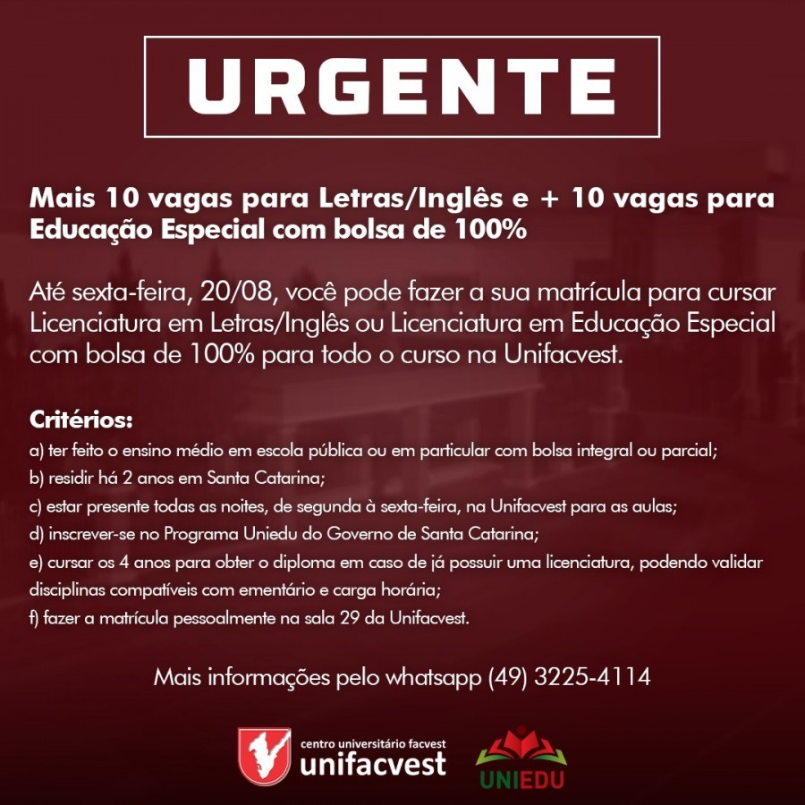 Mais 10 vagas para Letras/Inglês e mais 10 vagas para Educação Especial com bolsa de 100% na Unifacvest