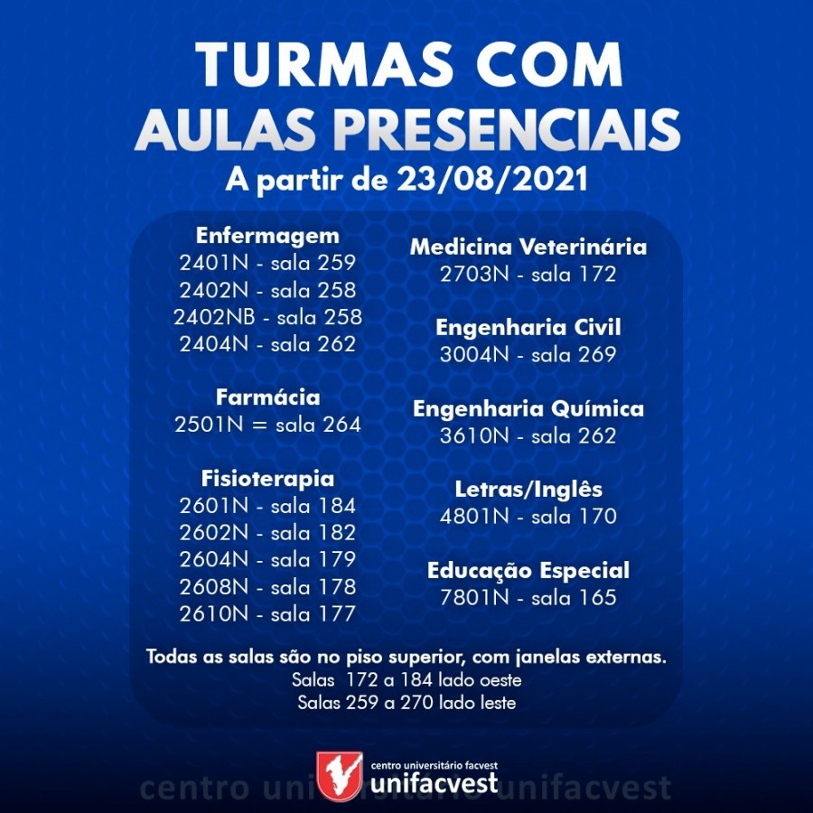 Veja as turmas que retornam nesta semana de 23 a 27/08. Todos os alunos que preencheram o formulário nestas turmas terão aulas semanalmente na Unifacvest em Lages. Na próxima semana serão anunciadas novas turmas para o retorno.