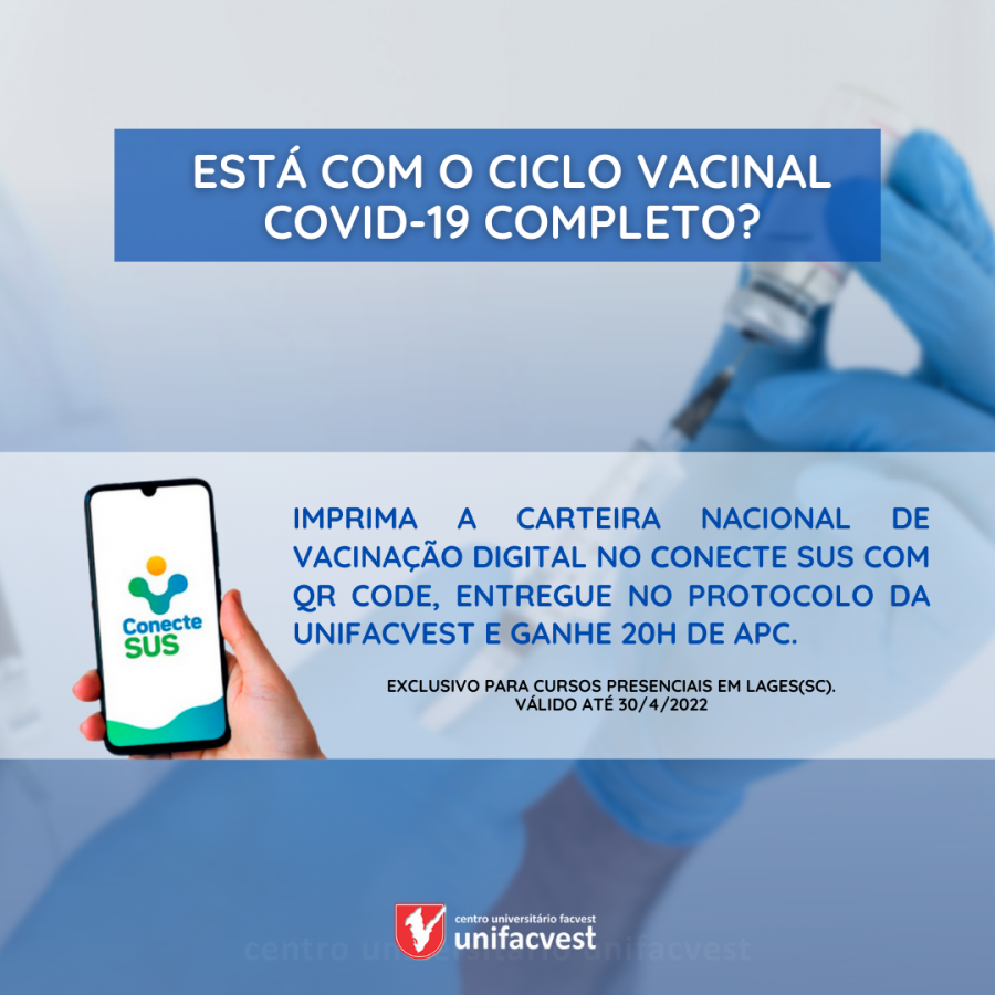 Imprima a carteira nacional de vacinação digital no conecte SUS com QR Code, entregue no protocolo da Unifacvest e ganhe 20h de APC.