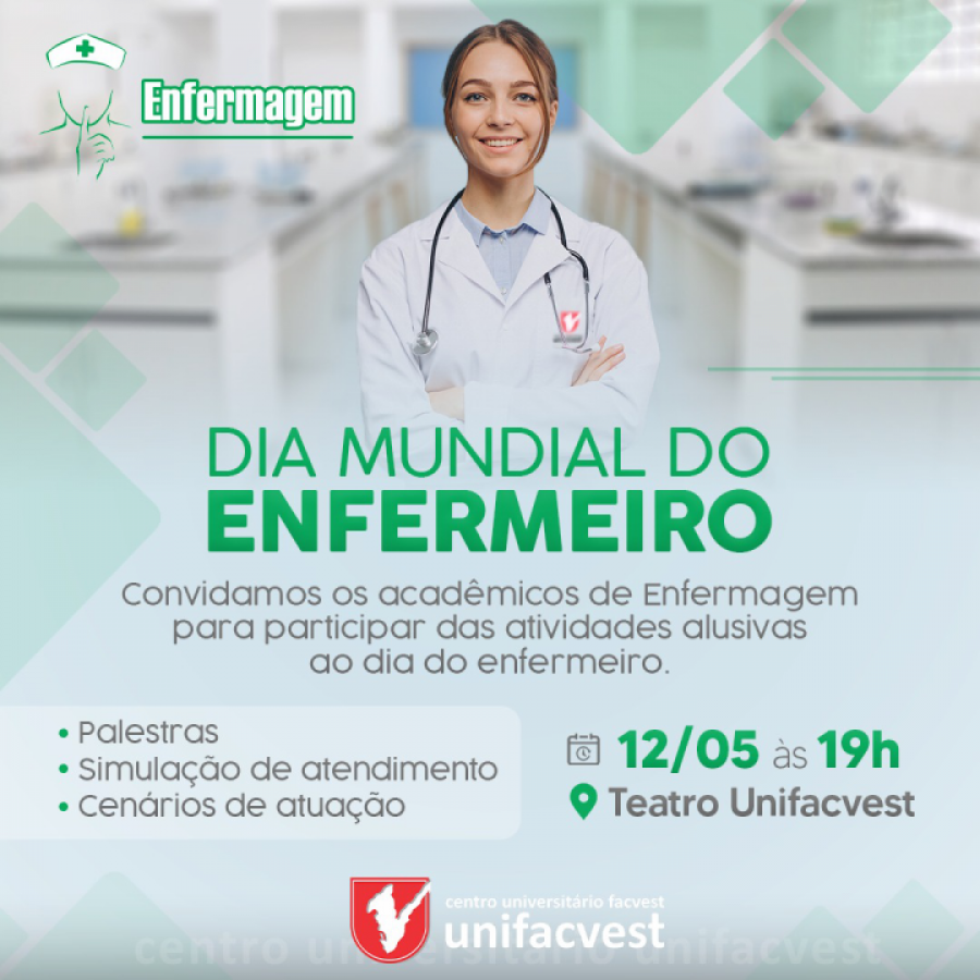 Convidamos os acadêmicos do curso de Enfermagem para participar das atividades alusivas ao dia do enfermeiro. O evento contará com palestras, simulação de atendimento e apresentação dos cenários de atuação do enfermeiro. Não perca!