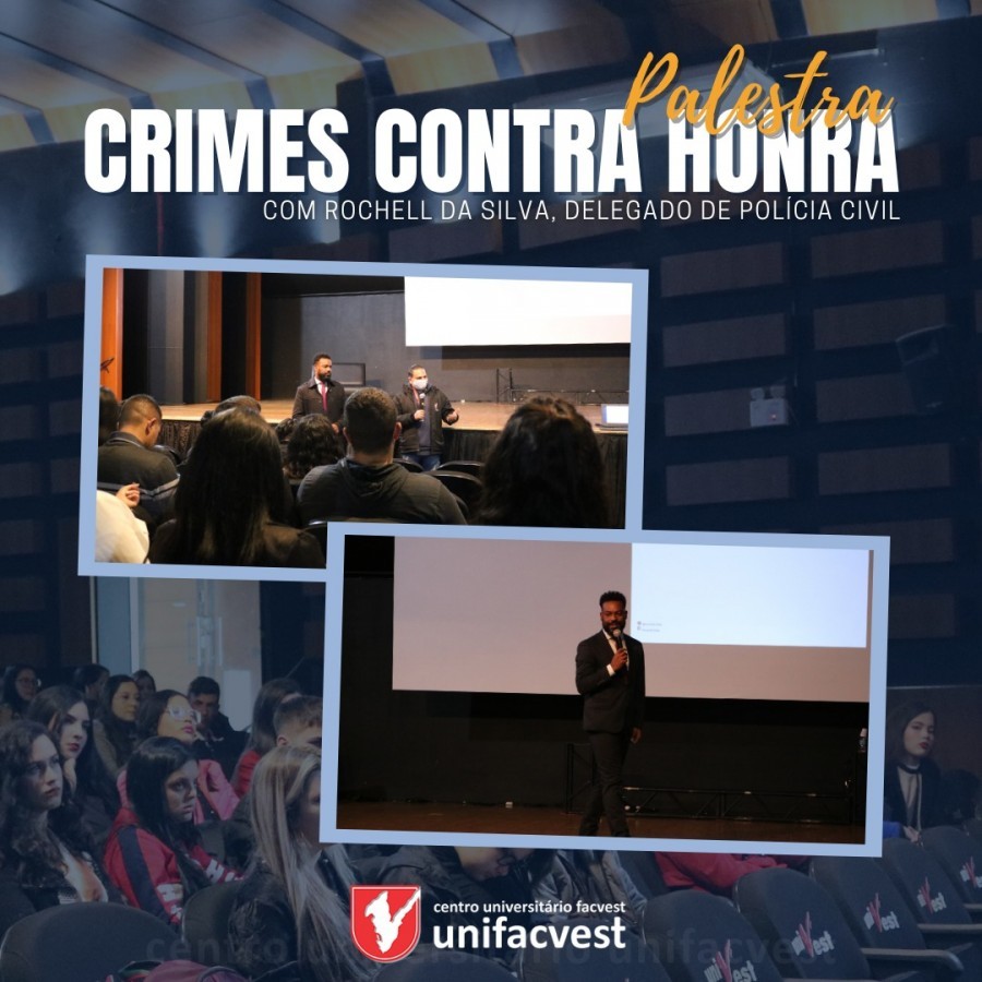 As turmas da primeira fase do curso de Direito da Unifacvest, participaram na noite de 09 de maio da palestra "Crimes Contra a Honra", ministrada pelo Delegado de Polícia Civil, Rochell da Silva. O evento organizado pela professora Josiane Brugnera, foi realizado no Teatro da Instituição.