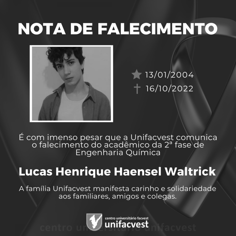 É com imenso pesar que a Unifacvest comunica o falecimento de Lucas Henrique Haensel Waltrick, acadêmico da 2ª fase de Engenharia Química.