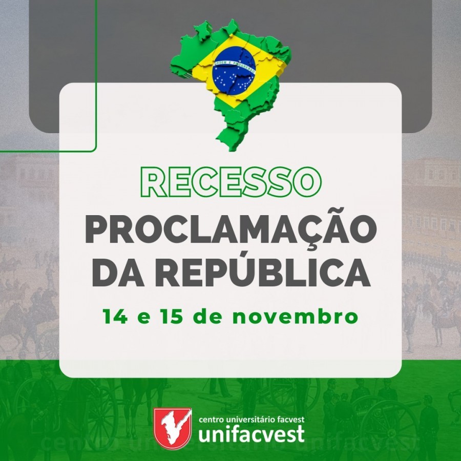 Recesso de Proclamação da República dias 14 e 15 de novembro. Retornamos na quarta-feira, dia 16 de novembro.