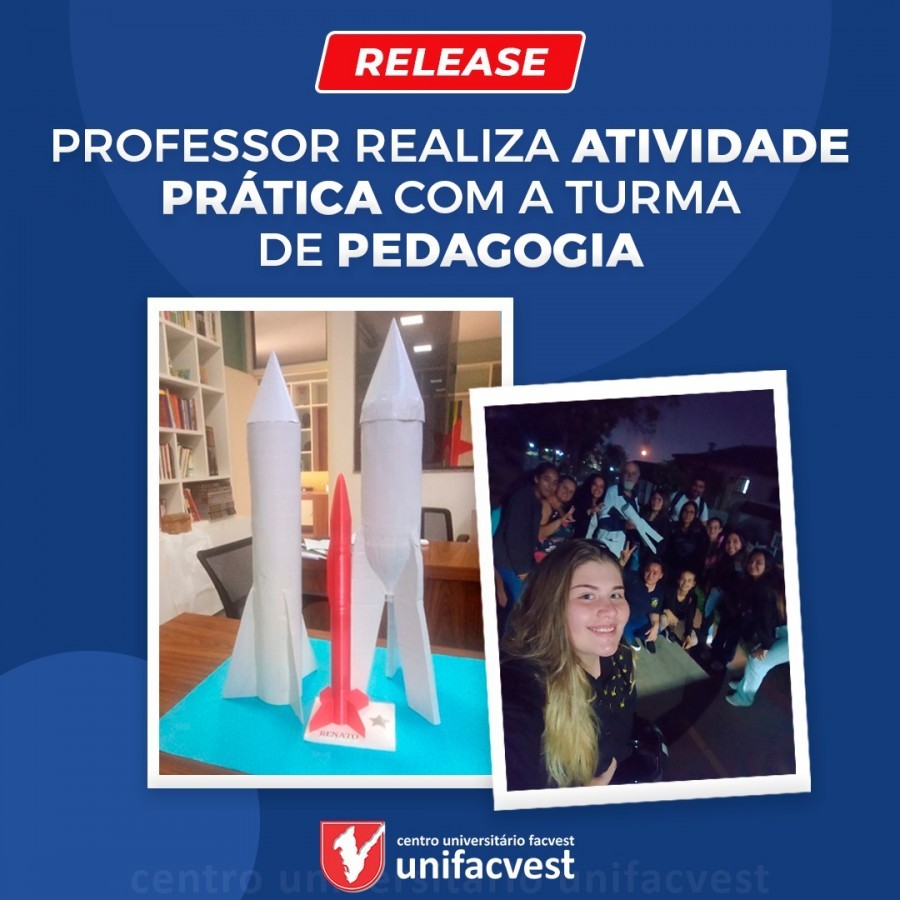 A turma da 2ª fase do curso de Pedagogia, participou no mês de novembro, de uma atividade prática na disciplina de Concepções e Conteúdos de Ciências e Biologia, ministrada pelo professor Renato Rodrigues. Na ocasião, o professor construiu um foguete com garrafa pet e demais materiais recicláveis, utilizando vinagre e bicarbonato de sódio para causar a reação química necessária para o foguete voar.