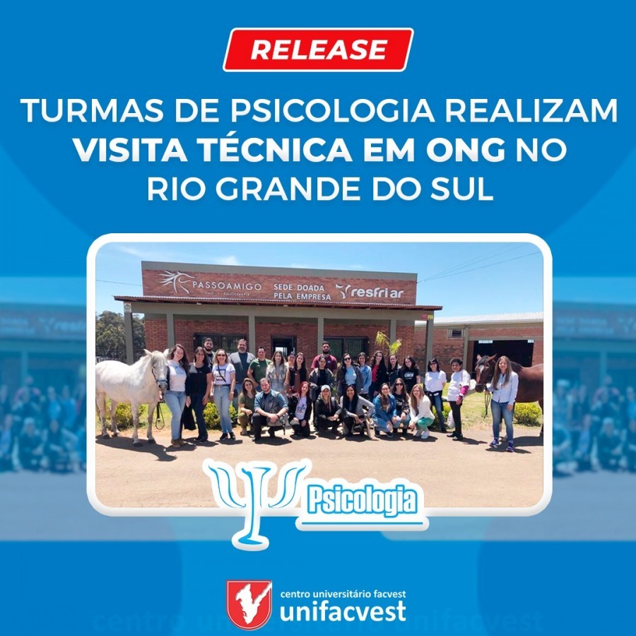 As turmas da 7ª e 8ª fase do curso de Psicologia da Unifacvest, acompanhadas da professora Lisana Dal Molin, realizaram no mês de novembro, uma visita técnica à ONG Passo Amigo, em Vacaria-RS, referente à disciplina de "Psicologia das Necessidades Especiais", ministrada pela professora. Durante a visita, os acadêmicos puderam acompanhar sessões de equoterapia (terapia que utiliza o cavalo dentro de uma abordagem multidisciplinar e interdisciplinar nas áreas de saúde, educação e equitação), grupos de convivência realizados pela psicóloga e também acompanharam o atendimento de Integração Sensorial realizado pela Terapeuta Ocupacional.