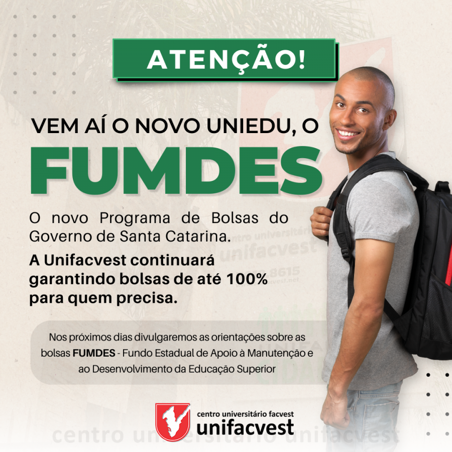 Nos próximos dias divulgaremos as orientações sobre as bolsas FUMDES - Fundo Estadual de Apoio à Manutenção e ao Desenvolvimento da Educação Superior.