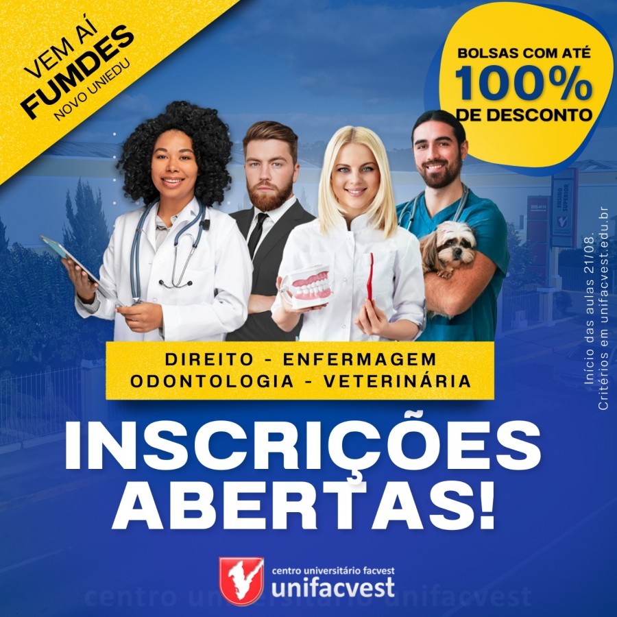 Você vai poder estudar na melhor Universidade com bolsa de até 100%. Vem aí o novo Uniedu, agora FUNDES do governo de Santa Catarina. Vem fazer Direito, Enfermagem, Odontologia e Veterinária no segundo semestre na Unifacvest. Inscreva-se agora com bolsa para todo o curso aqui ou pelo WhatsApp (49) 3225-4114.