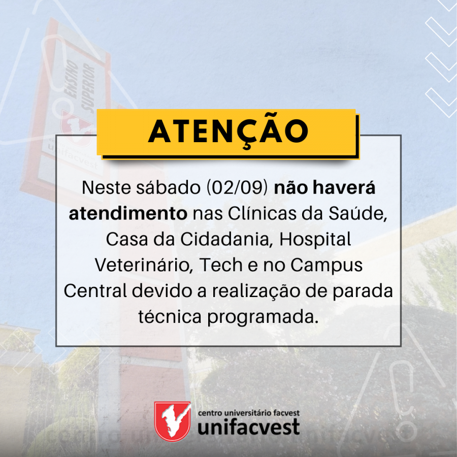 Neste sábado (02/09) não haverá atendimento nas Clínicas da Saúde, Casa da Cidadania, Hospital Veterinário, Tech e no Campus Central devido a realização de parada técnica programada.