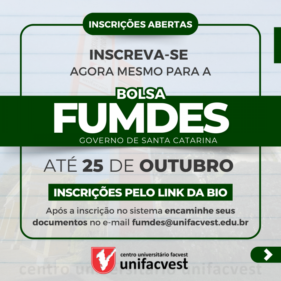 Estão abertas até dia 25/10 as inscrições para concorrer a bolsa FUMDES. Após a inscrição no sistema o aluno deve encaminhar seus documentos no e-mail .