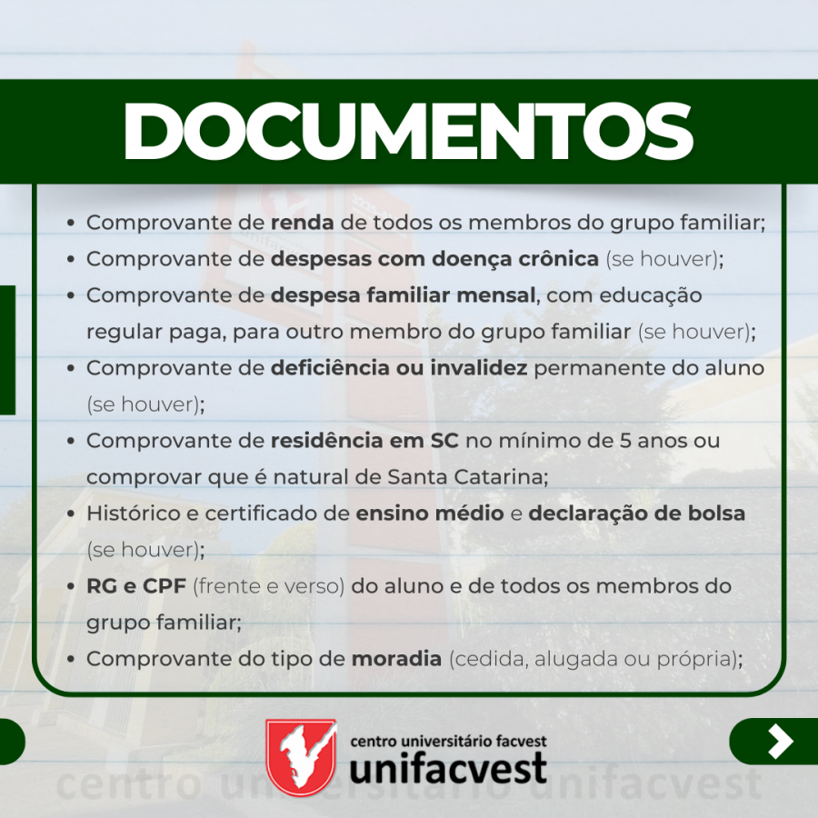 - Histórico e certificado de ensino médio e declaração de bolsa (se houver);