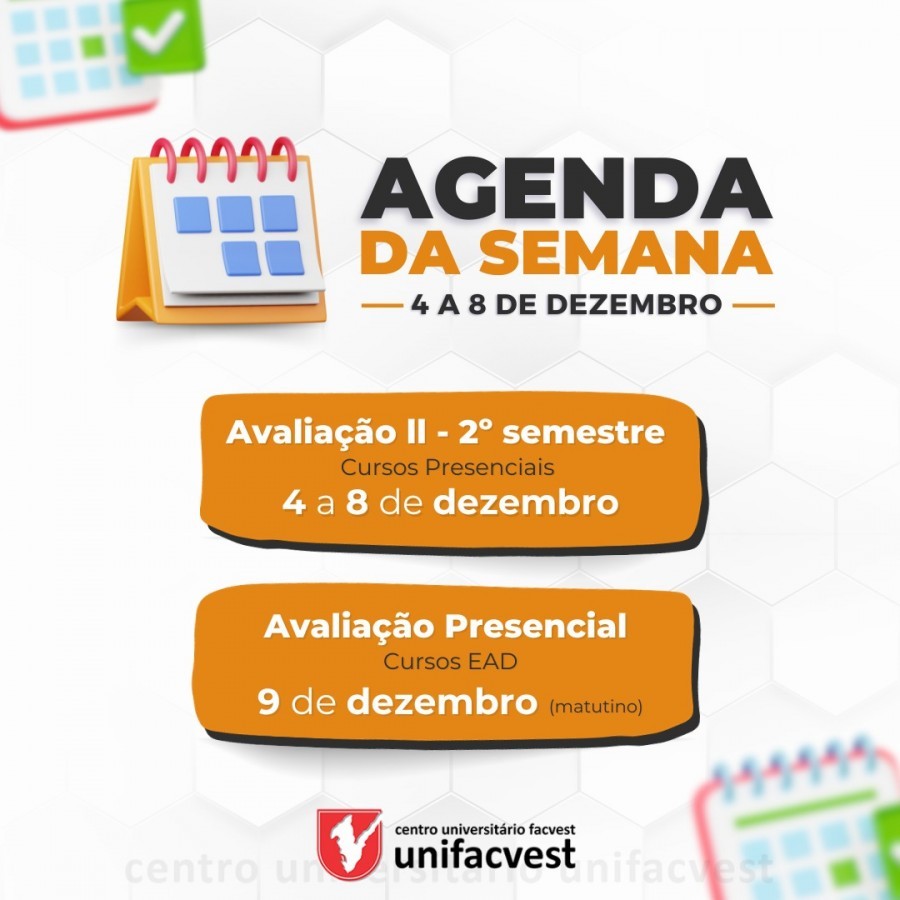 Atenção! De 4 a 8 de dezembro acontece a Semana de Avaliações II dos Cursos Presenciais. No sábado, dia 9, pela manhã, a Avaliação Presencial das Disciplinas EAD. Elas também poderão ser realizadas de 11 a 15 de dezembro, à noite.
