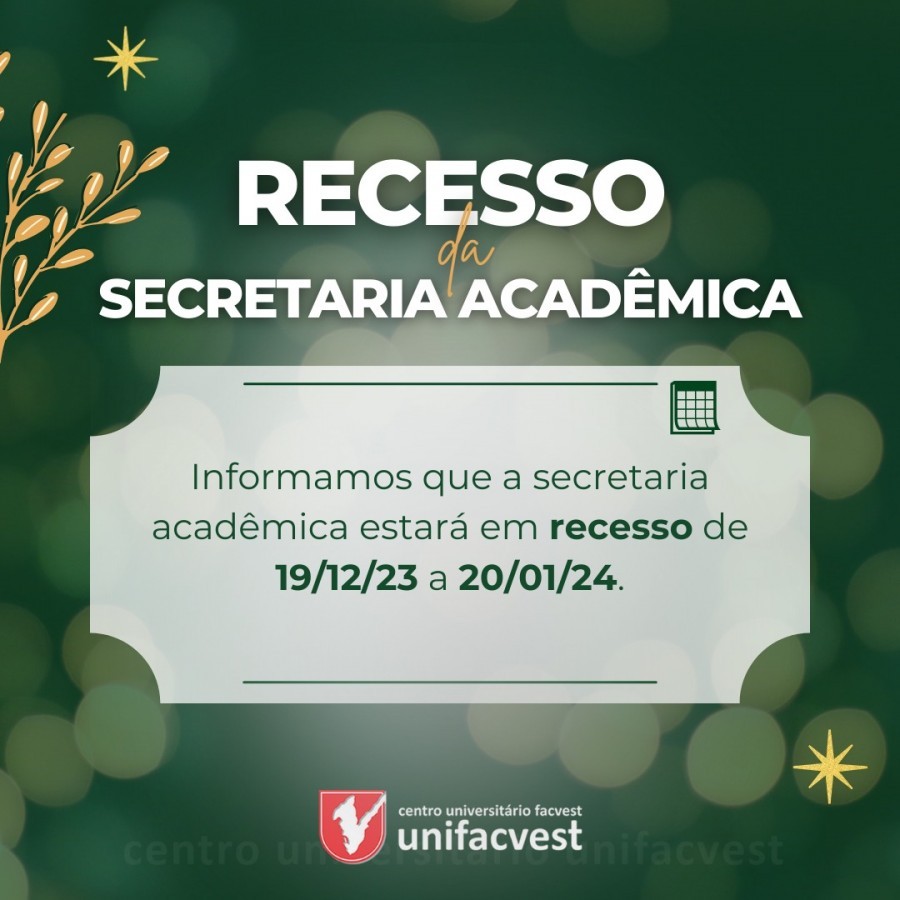 A Secretaria Acadêmica estará em recesso de 19/12/2023 a 20/01/2024, exceto para as atividades de matrícula e rematrícula.