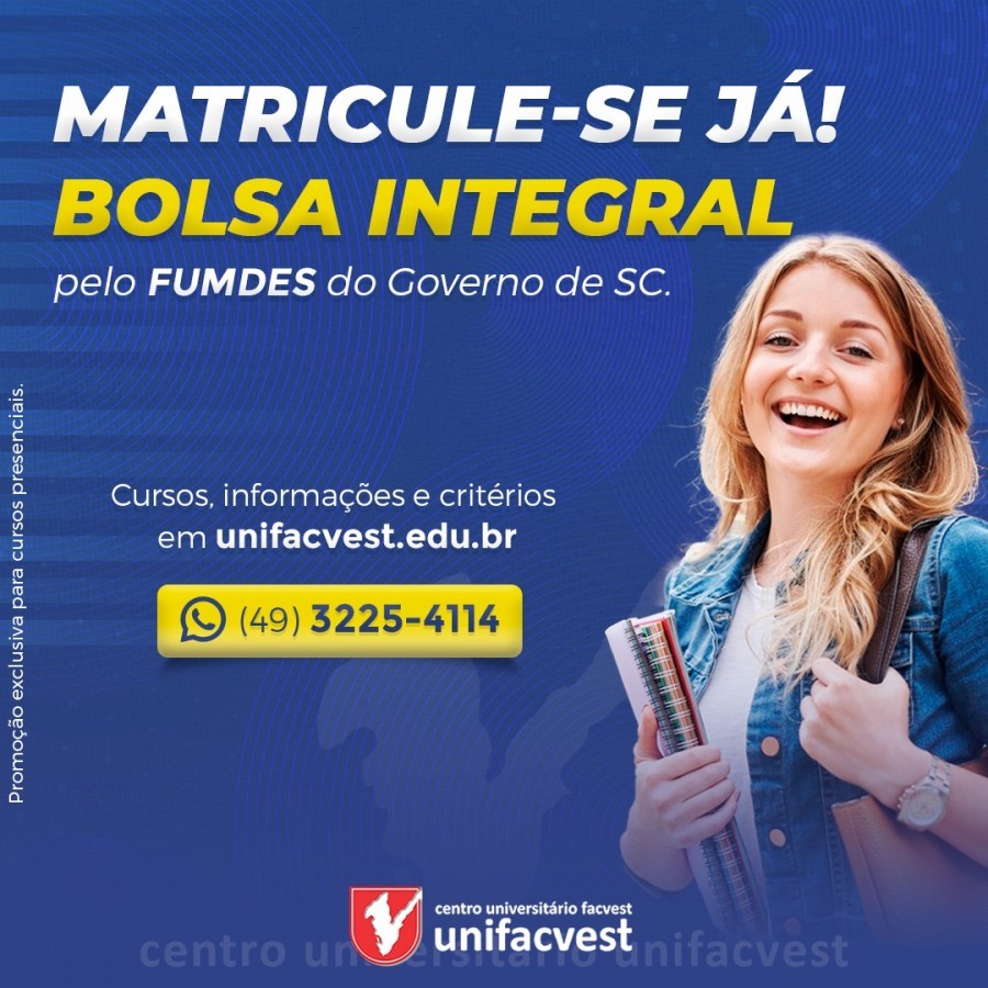 A Unifacvest está com matrículas abertas para todos os Cursos Presencias com Bolsa Integral pelo Programa FUMDES do Governo de Santa Catarina.