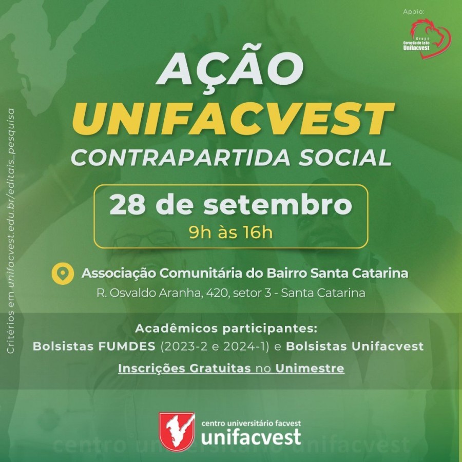A Unifacvest com o apoio do Grupo Coração de Leão e da Associação de Moradores do Bairro Santa Catarina (AMBSC) realizará a Ação Unifacvest - Contrapartida Social no sábado, dia 28 de setembro, das 9h às 16h, no Bairro Santa Catarina, em Lages. O ponto de encontro será na Rua Osvaldo Aranha. 420 - setor 3.