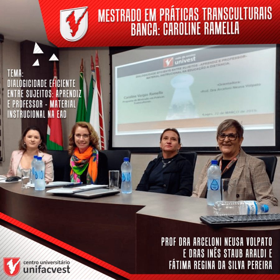 Dialogicidade eficiente entre sujeitos: aprendiz e professor - material instrucional na educação a distância foi o título da dissertação de Caroline Ramella (foto: primeira à esquerda), aprovada em banca do Programa de Mestrado Profissional Interdisciplinar em Práticas Transculturais da Unifacvest no mês de março. A Professora Dra. Arceloni Neusa Volpato (foto: primeira à direita) orientou o desenvolvimento do produto e para a defesa foram convidadas as professoras Dra. Inês Staub Araldi e Dra. Fátima Regina da Silva Pereira (foto: segunda da esquerda para a direita).