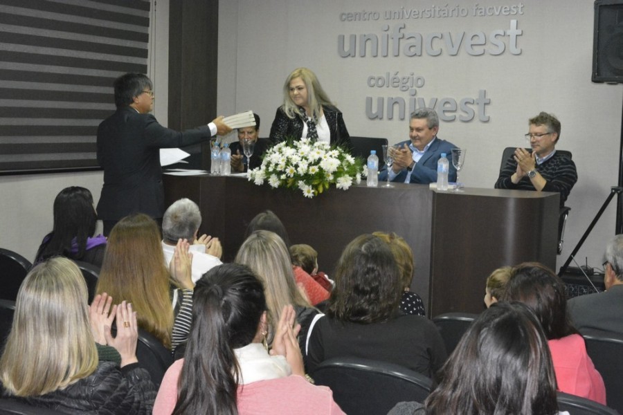 Após a fala, a autora fez a entrega simbólica de um exemplar ao reitor da Unifacvest, Giovani Broering, e autografou livros para os demais presentes.
