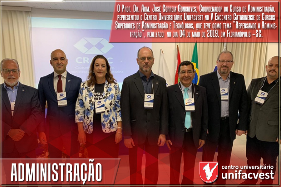 ADMINISTRAÇÃO: O Prof. Dr. Adm. José Correia Gonçalves, Coordenador do Curso de Administração, representou o Centro Universitário Unifacvest no V Encontro Catarinense de Cursos Superiores de Administração e Tecnólogos, que teve como tema “Repensando a Administração”, realizado no dia 04 de maio de 2019, em Florianópolis –SC.