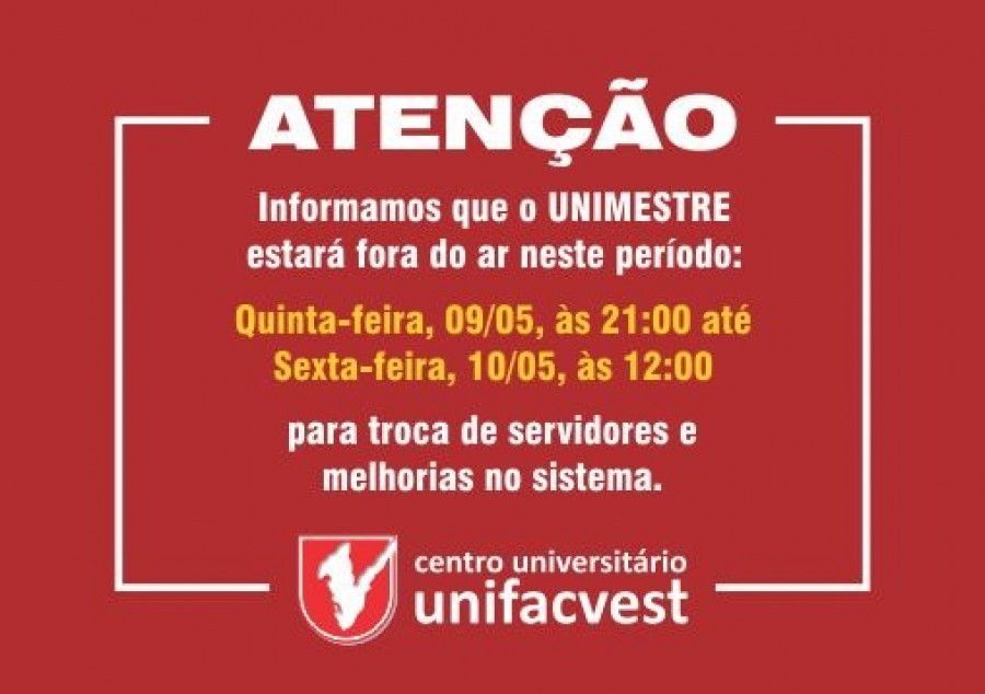 Estamos concluindo a migração de dados e atualização da Plataforma Unimestre nos novos servidores e o acesso não será possível no seguinte período: