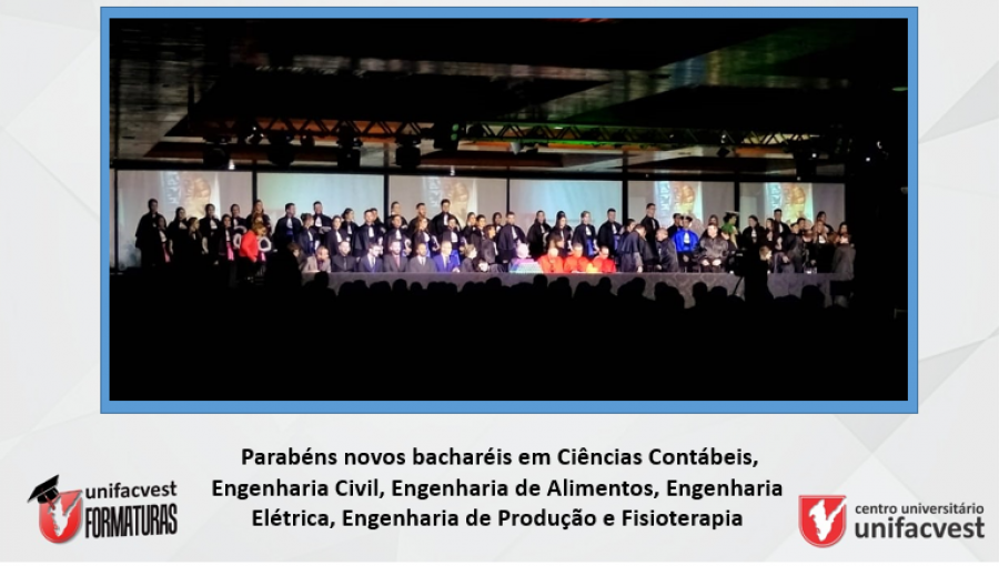 Parabéns aos novos profissionais de Ciências Contábeis, Engenharia Civil, Engenharia de Alimentos, Engenharia Elétrica, Engenharia de Produção e Fisioterapia. A solenidade acontece neste momento no Clube de Caça e Tiro 1º de Julho, em Lages (SC).