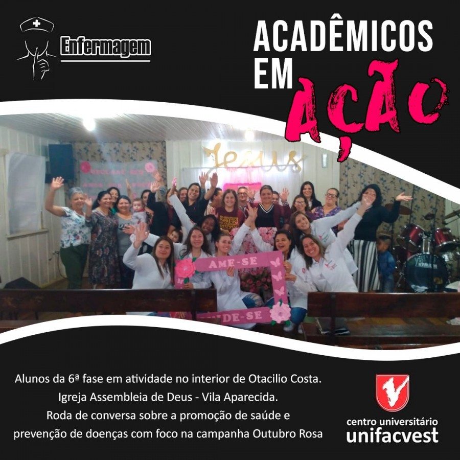 Os acadêmicos do Curso de Enfermagem da Unifacvest estão desenvolvendo várias ações relacionadas ao Outubro Rosa - mês de prevenção ao câncer de mama e à saúde da mulher. Confira nas fotos.