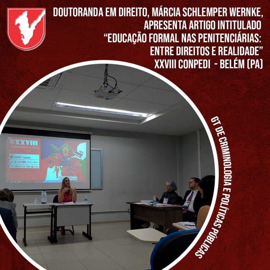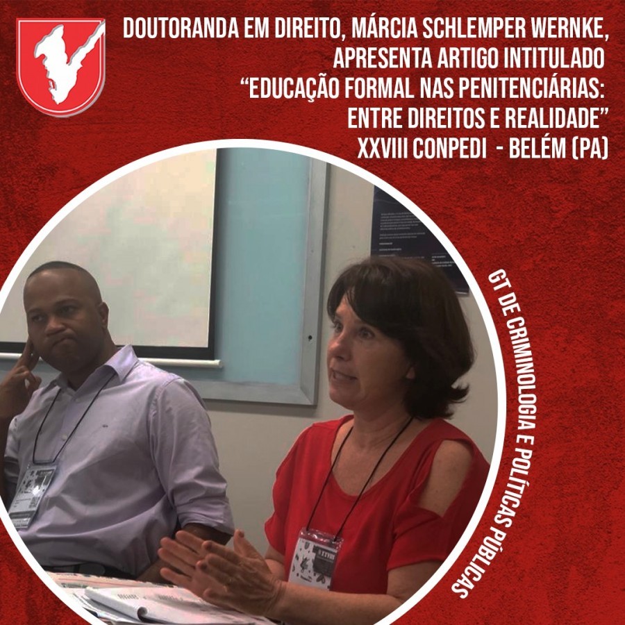A doutoranda Márcia schlemper Wernke, do Dinter em Direito da Unifacvest/UVA, participa do XXVIII congresso nacional do CONPEDI, em Belém (PA), apresentando o artigo intitulado “Educação formal nas penitenciárias: entre direitos e realidade”.