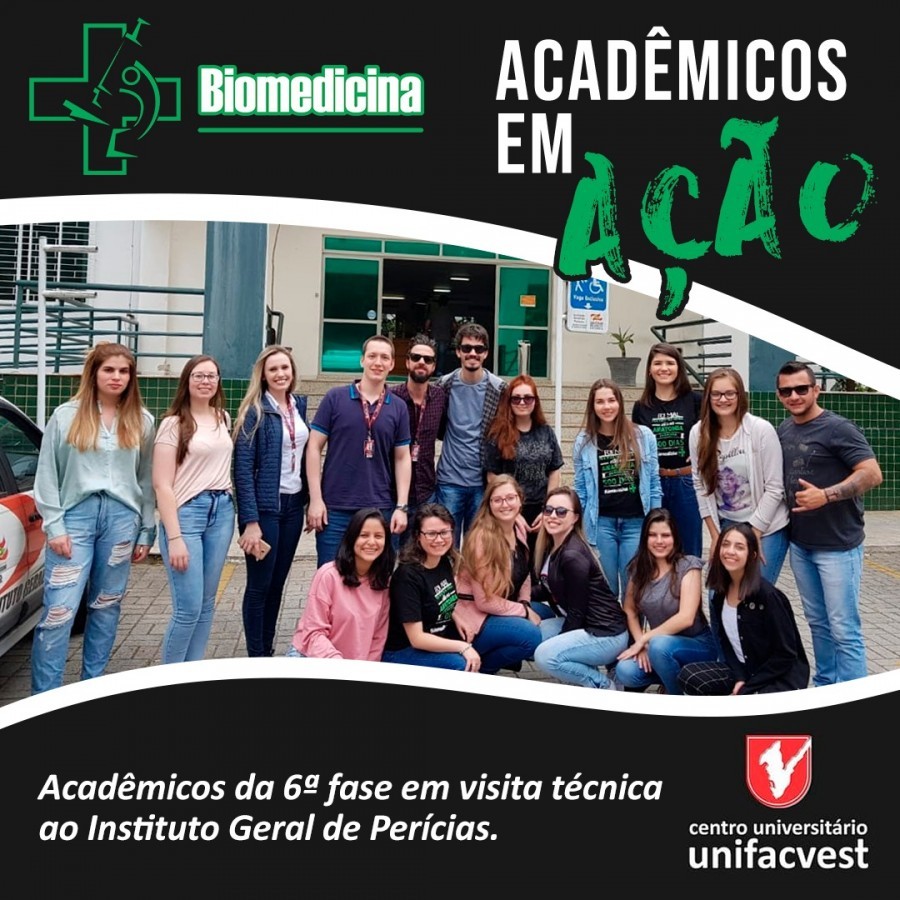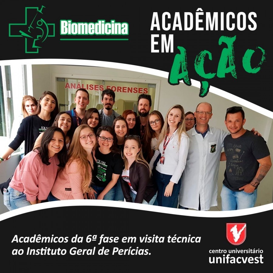 Os professores Camila Buzzi Colley, Jader Ruchel e Lucas Gonçalves Ferreira com o Perito Criminal Bioquímico Fernando Meurer e os acadêmicos da 6 fase de biomedicina em visita técnica ao Instituto Geral de Perícias.