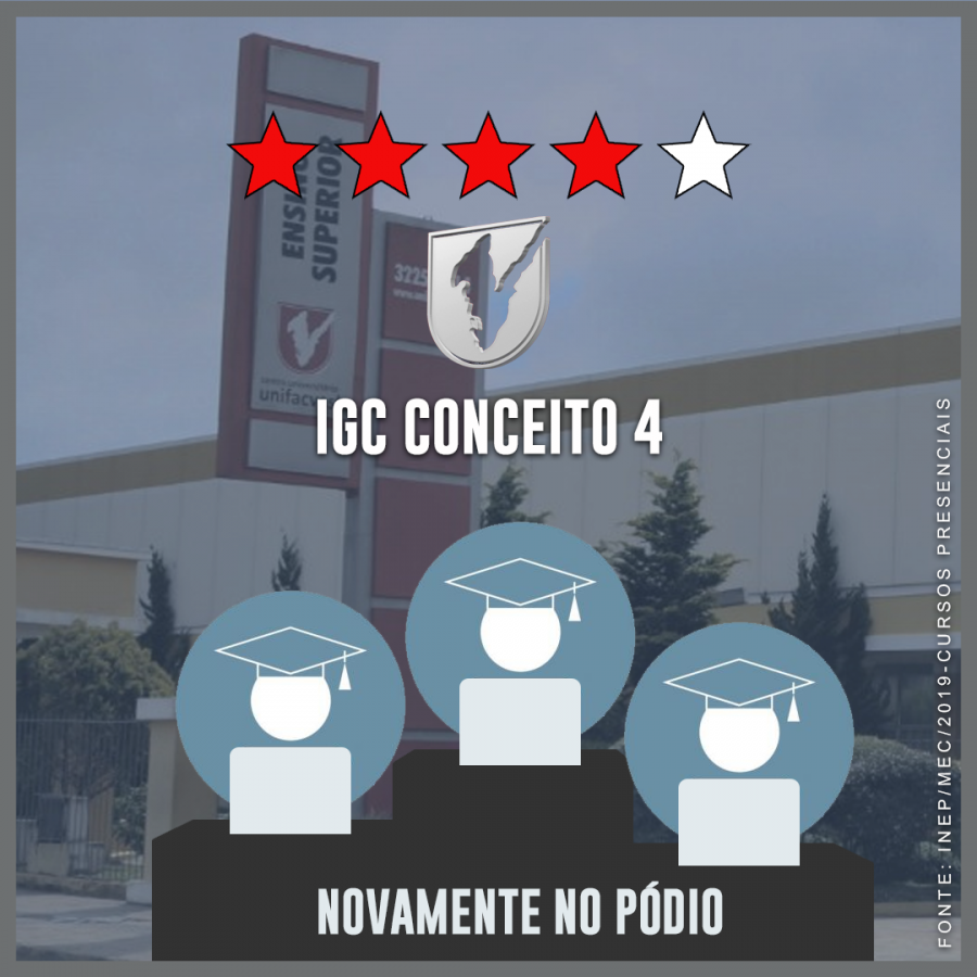 O INEP/MEC divulga hoje o ranking do Índice Geral de Cursos (IGC) referente ao ano de 2018 para cursos preseciais. São avaliadas 2072 universidades, centros universitários e faculdades públicas e privadas do Brasil. A Unifacvest, com 28 cursos avaliados em todas as áreas do conhecimento, ampliou seu índice de 3,63 em 2017 para 3,6813 em 2018 e continua novamente no pódio entre as três melhores instituições universitárias de Santa Catarina com IGC 4 (na faixa).