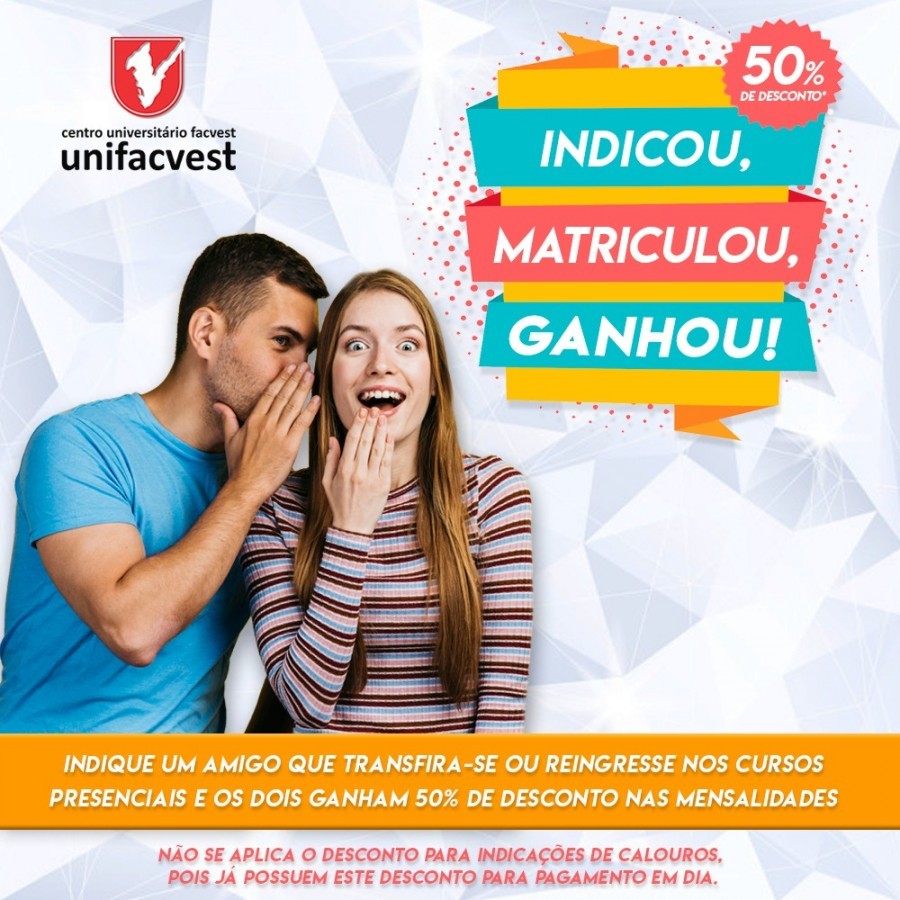 A Promoção amigos podem mais continua. Você que é nosso aluno e ainda não tem 50% de desconto nas mensalidades poderá consegui-lo agora. Para isso, basta indicar, até o dia 29 de fevereiro, um amigo que venha para a Unifacvest de transferência de outra universidade ou que reingresse após ter parado ou trancado há mais de um semestre seu curso. Esta promoção não é cumulativa com outra e o desconto máximo que cada aluno poderá ter é de 50%. Exemplo: se tiver desconto de 30% conseguirá, com a indicação, mais 20% atingindo o limite de 50%. Para que a promoção seja efetivada os dois amigos precisam vir juntos à Unifacvest e fazer a matrícula. No ato, será preenchido um formulário com os dados dos dois amigos e enviado para a pró-reitoria administrativo-financeira para a concessão dos descontos respectivos. O desconto permanece enquanto o indicado estiver matriculado.