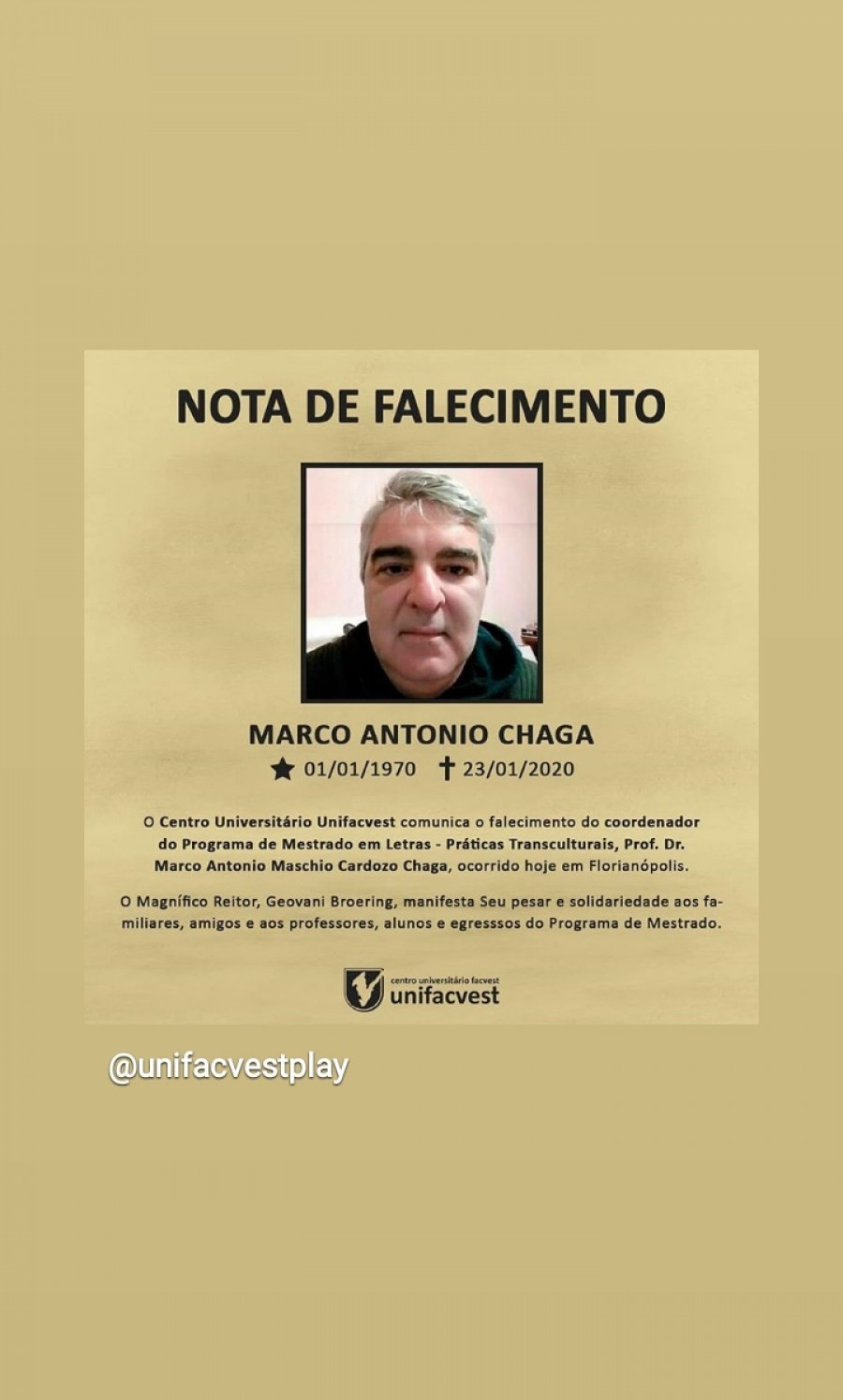 Comunicamos o falecimento do coordenador do programa de Mestrado em Letras - Práticas Transculturais da Unifacvest, Prof. Dr. Marco Antonio Maschio Cardozo Chaga ocorrido hoje em Florianópolis.