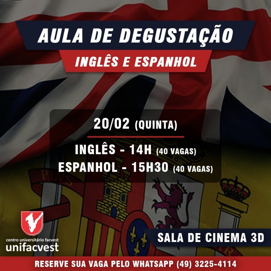 #VemPraUnifacvest e participe das aulas demonstrativas gratuitas de Inglês e Espanhol. Garanta sua vaga. Vai ter cine, pipoca e passeio guiado. Tudo na língua escolhida. Chama no whatsapp +55 (49) 3225-4114