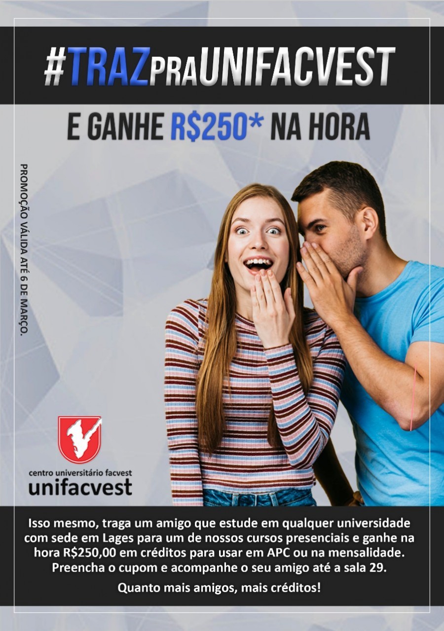 Traga um amigo que estude em qualquer universidade com sede em Lages (SC) para um dos cursos presenciais da Unifacvest e ganhe duzentos e cinquenta reais em créditos para usar em horas ApC ou na mensalidade. É ISSO MESMO! Preencha o cupom disponível no campus central, acompanhe seu amigo até a sala 29 e ganhe duzentos e cinquenta reais em crédito. Vantagens como esta? Só a Unifacvest tem. Promoção válida por tempo determinado, Alunos, professores e funcionários podem indicar e TRAZER.