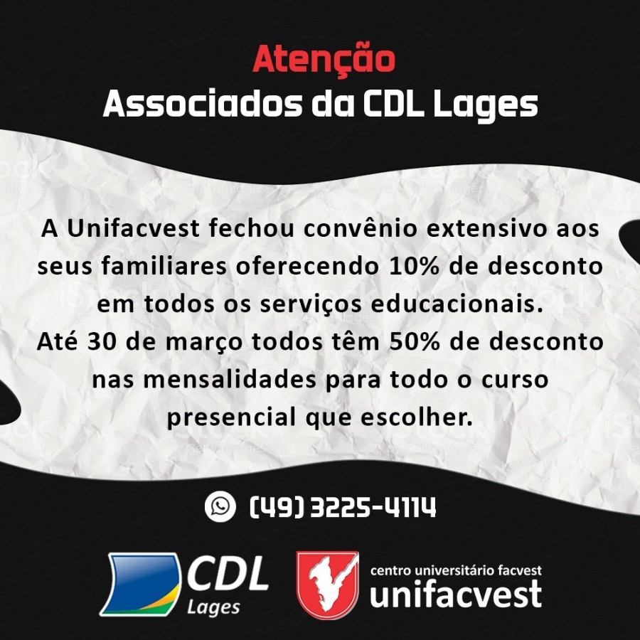 A Unifacvest estabeleceu parceria com os associados e familiares da @cdllages com descontos imperdíveis para todos os serviços educacionais da Universidade.
