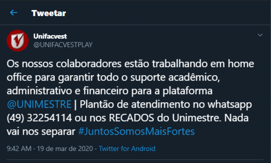 Os nossos colaboradores estão trabalhando em home office para garantir todo o suporte acadêmico, administrativo e financeiro para a plataforma
