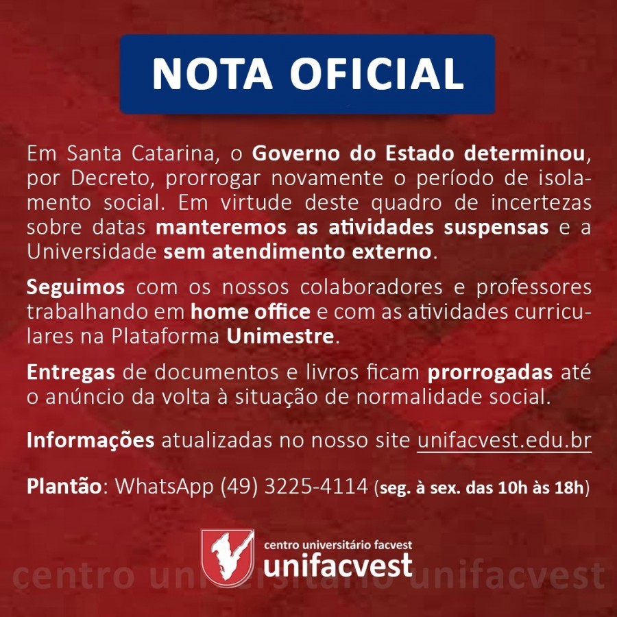 Em Santa Catarina, o Governo do Estado determinou, por Decreto, prorrogar novamente o período de isolamento social. Em virtude deste quadro de incertezas sobre datas manteremos as atividades suspensas e a Universidade sem atendimento externo.