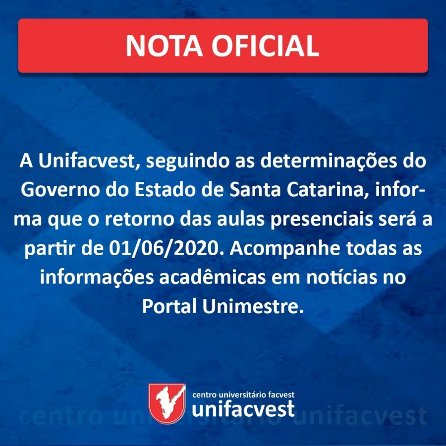 A Unifacvest, seguindo as determinações do Governo do Estado de Santa Catarina, informa que o retorno das aulas presenciais será a partir de 01/06/2020. Acompanhe todas as informações acadêmicas em notícias no Portal Unimestre.