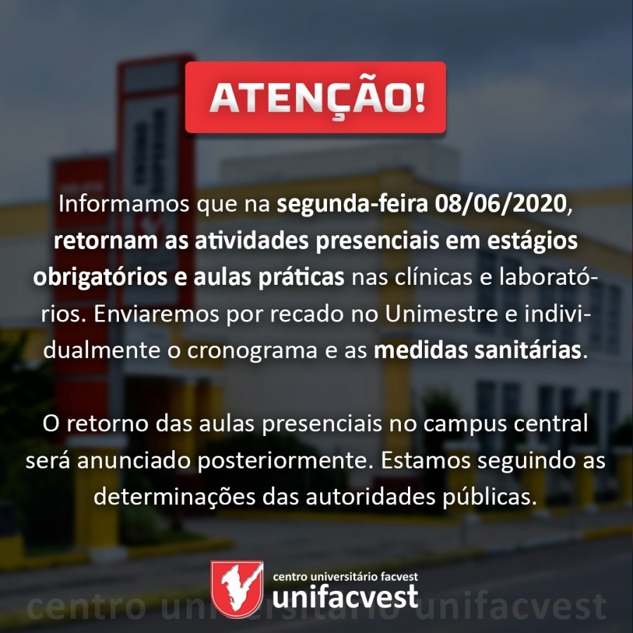 Informamos que na segunda-feira, 08/06/2020, retornam as atividades presenciais em estágios obrigatórios e aulas práticas nas clínicas e laboratórios. Os alunos receberão por recado no Unimestre e individualmente o cronograma.