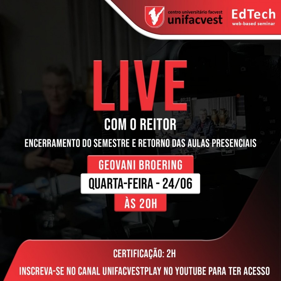 O Reitor Geovani Broering anunciará aos acadêmicos os procedimentos adotados pela Unifacvest para o final do primeiro semestre e o retorno das aulas presenciais no campus central para o segundo semestre.
